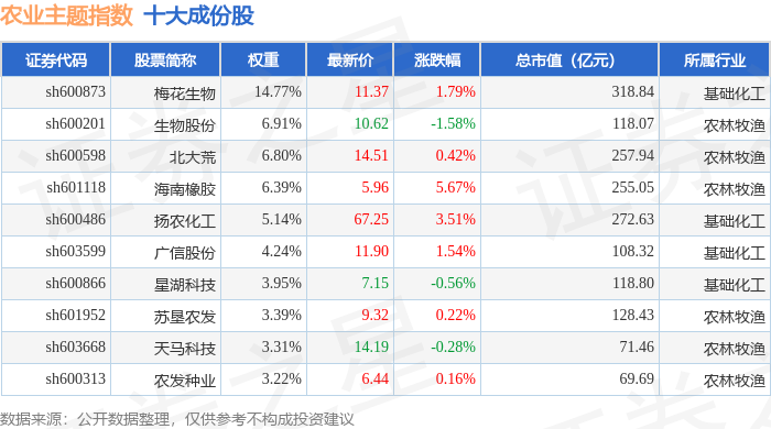 资金流向方面,农业主题(000122)指数成份股当日主力资金净流出合计8910.59万元,游资资金净流入合计8614.67万元,散户资金净流入合计295.53万元。成份股资金流向详情见下表: