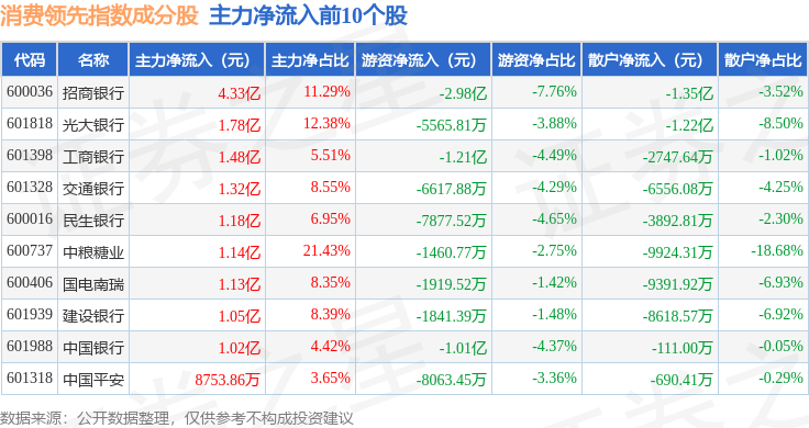 资金流向方面,消费领先(000148)指数成份股当日主力资金净流出合计22.44亿元,游资资金净流入合计8.67亿元,散户资金净流入合计13.76亿元。成份股资金流向详情见下表:
