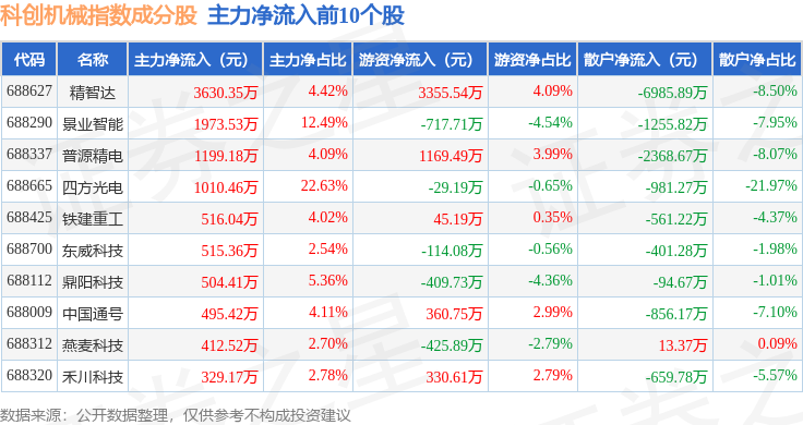资金流向方面,科创机械(000693)指数成份股当日主力资金净流出合计6.9亿元,游资资金净流入合计5.64亿元,散户资金净流入合计1.26亿元。成份股资金流向详情见下表: