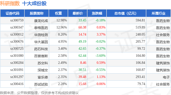 科研指数(399243)十大成份股详情如下: