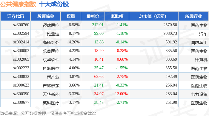 公共健康(399277)指数十大成份股详情如下: