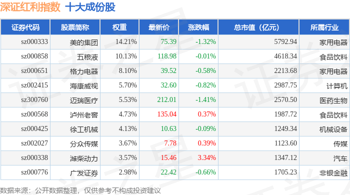 证券之星消息,11月3日,深证红利(399324)指数报收于9104.62点,跌0.02%,成交364.66亿元,换手率1.22%。当日该指数成份股中,上涨的有24家,神火股份以5.7%的涨幅领涨,下跌的有16家,藏格矿业以2.21%的跌幅领跌。