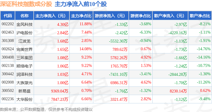 资金流向方面,深证科技(399339)指数成份股当日主力资金净流出合计77.84亿元,游资资金净流入合计11.84亿元,散户资金净流入合计66.0亿元。成份股资金流向详情见下表: