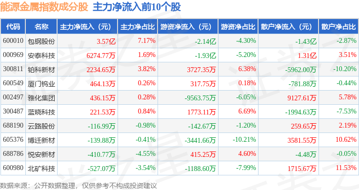 资金流向方面,能源金属(399366)指数成份股当日主力资金净流出合计47.61亿元,游资资金净流出合计551.74万元,散户资金净流入合计47.67亿元。成份股资金流向详情见下表: