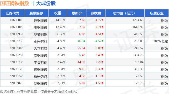国证钢铁(399440)指数十大成份股详情如下: