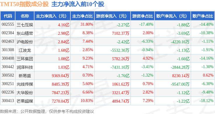 资金流向方面,TMT50(399610)指数成份股当日主力资金净流出合计31.61亿元,游资资金净流入合计5.15亿元,散户资金净流入合计26.45亿元。成份股资金流向详情见下表:
