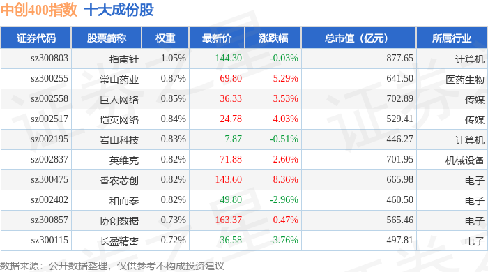 证券之星消息,11月3日,中创400(399624)指数报收于2523.44点,涨0.38%,成交2754.97亿元,换手率3.21%。当日该指数成份股中,上涨的有245家,天华新能以12.0%的涨幅领涨,下跌的有150家,中材科技以8.51%的跌幅领跌。