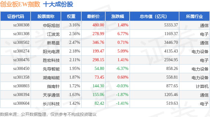 证券之星消息,11月3日,创业板EW(399635)指数报收于2142.06点,涨0.32%,成交2096.29亿元,换手率3.15%。当日该指数成份股中,上涨的有56家,天华新能以12.0%的涨幅领涨,下跌的有44家,金力永磁以6.97%的跌幅领跌。
