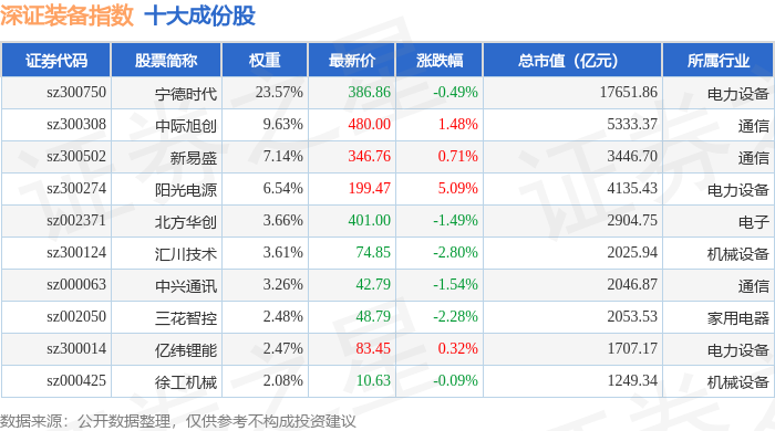 证券之星消息,11月3日,深证装备(399636)指数报收于7835.47点,涨0.35%,成交1724.25亿元,换手率3.15%。当日该指数成份股中,上涨的有49家,浙富控股以9.98%的涨幅领涨,下跌的有29家,先导智能以6.37%的跌幅领跌。