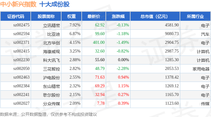 证券之星消息,11月3日,中小新兴(399642)指数报收于2332.41点,涨0.15%,成交1631.38亿元,换手率2.59%。当日该指数成份股中,上涨的有55家,三七互娱以10.01%的涨幅领涨,下跌的有41家,中材科技以8.51%的跌幅领跌。