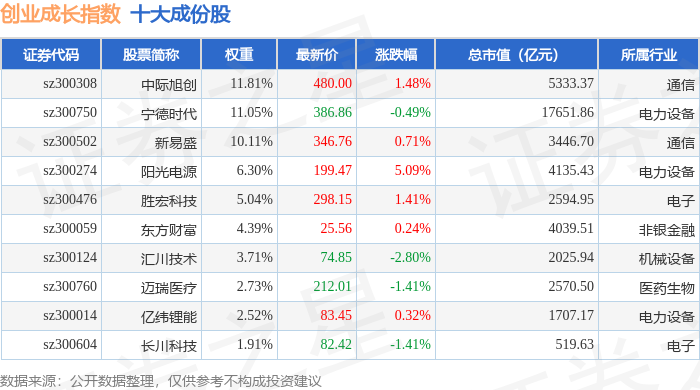 证券之星消息,11月3日,创业成长(399667)指数报收于5343.39点,涨0.21%,成交1605.46亿元,换手率3.43%。当日该指数成份股中,上涨的有23家,阳光电源以5.09%的涨幅领涨,下跌的有27家,金力永磁以6.97%的跌幅领跌。