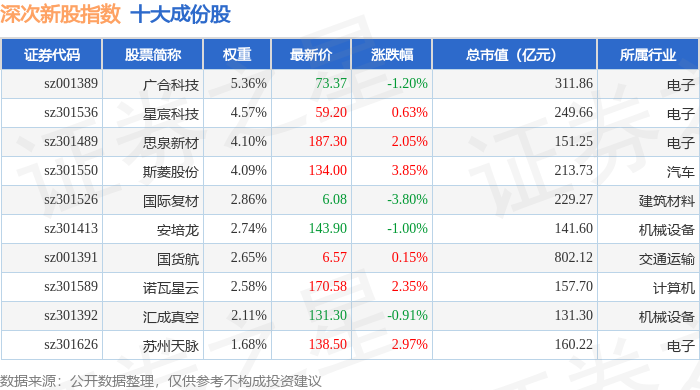 深次新股(399678)指数十大成份股详情如下: