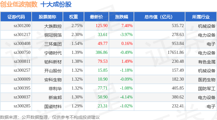 证券之星消息,11月3日,创业低波(399692)指数报收于3994.22点,涨0.3%,成交543.67亿元,换手率1.87%。当日该指数成份股中,上涨的有58家,大族数控以7.4%的涨幅领涨,下跌的有42家,新宙邦以4.14%的跌幅领跌。