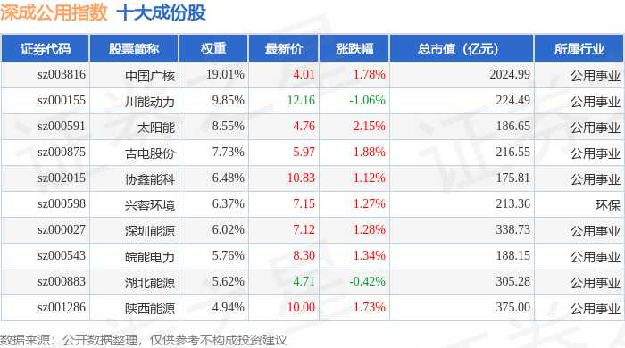 证券之星消息,11月3日,深成公用(399689)指数报收于885.28点,涨1.04%,成交42.77亿元,换手率0.74%。当日该指数成份股中,上涨的有12家,太阳能以2.15%的涨幅领涨,下跌的有3家,川能动力以1.06%的跌幅领跌。