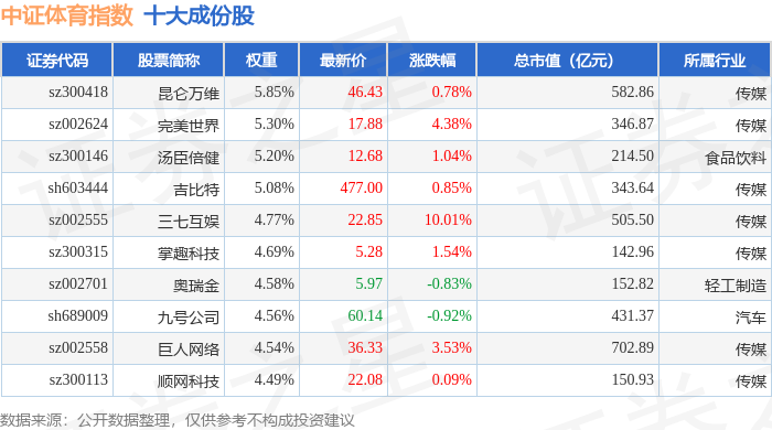 中证体育(399804)指数十大成份股详情如下: