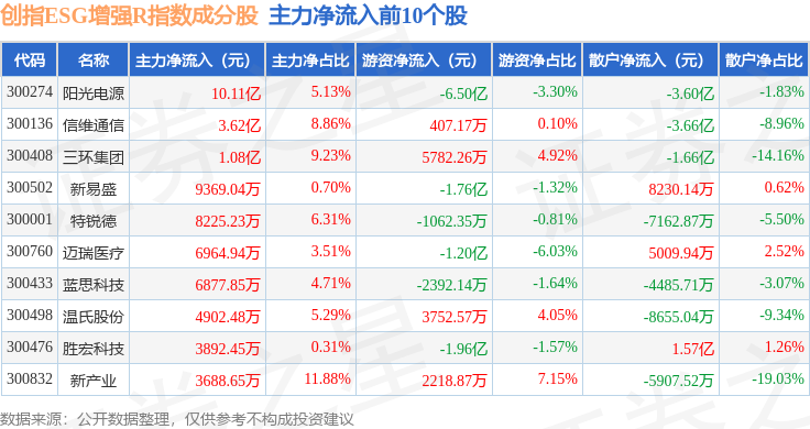 资金流向方面,创指ESG增强R(470034)指数成份股当日主力资金净流出合计8.81亿元,游资资金净流入合计2.44亿元,散户资金净流入合计6.38亿元。成份股资金流向详情见下表: