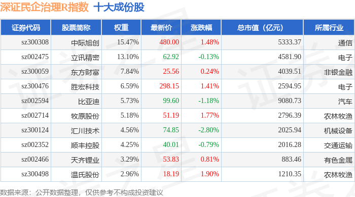 深证民企治理R(470058)指数十大成份股详情如下: