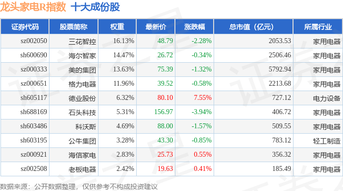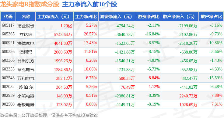 资金流向方面,龙头家电R(480028)指数成份股当日主力资金净流出合计11.78亿元,游资资金净流出合计2.09亿元,散户资金净流入合计13.86亿元。成份股资金流向详情见下表: