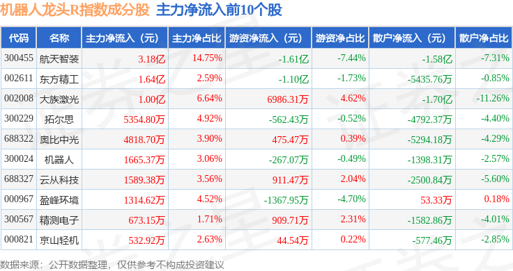 资金流向方面,机器人龙头R(480071)指数成份股当日主力资金净流出合计22.54亿元,游资资金净流入合计4.63亿元,散户资金净流入合计17.9亿元。成份股资金流向详情见下表: