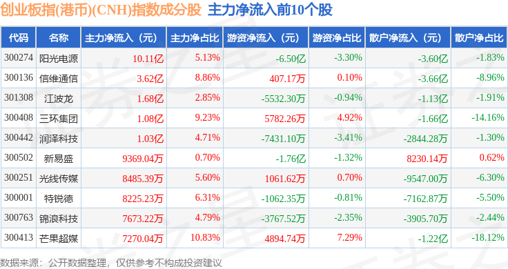 资金流向方面,创业板指(港币)(CNH)(970006)指数成份股当日主力资金净流出合计43.68亿元,游资资金净流入合计13.55亿元,散户资金净流入合计30.13亿元。成份股资金流向详情见下表:
