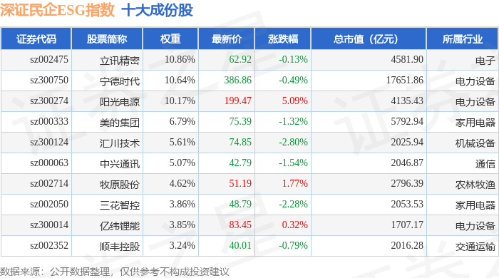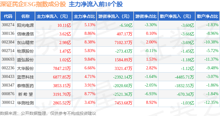 资金流向方面,深证民企ESG(970056)指数成份股当日主力资金净流出合计24.44亿元,游资资金净流入合计2.17亿元,散户资金净流入合计22.27亿元。成份股资金流向详情见下表: