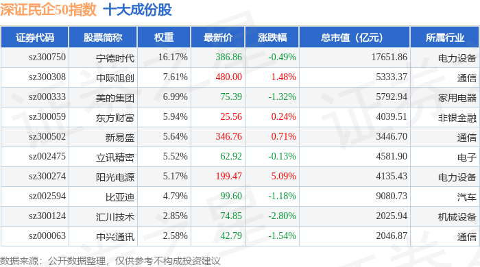 证券之星消息,11月3日,深证民企50(970057)指数报收于3395.21点,涨0.11%,成交1590.36亿元,换手率1.87%。当日该指数成份股中,上涨的有26家,阳光电源以5.09%的涨幅领涨,下跌的有24家,格林美以3.05%的跌幅领跌。