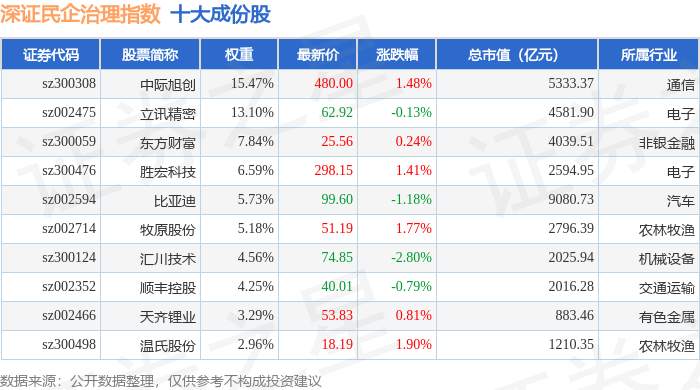 证券之星消息,11月3日,深证民企治理(970058)指数报收于2000.09点,涨0.19%,成交1262.89亿元,换手率2.09%。当日该指数成份股中,上涨的有31家,华测检测以3.37%的涨幅领涨,下跌的有19家,先导智能以6.37%的跌幅领跌。