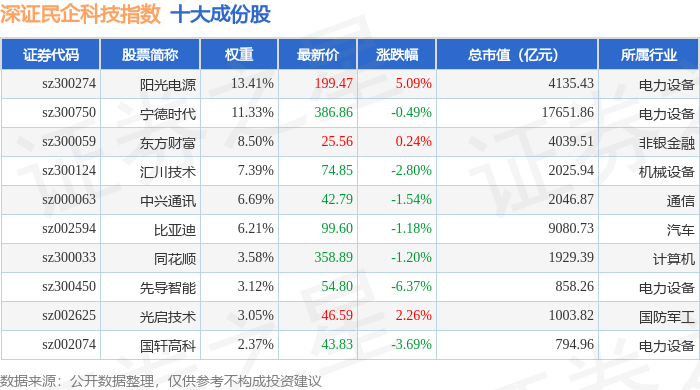 证券之星消息,11月3日,深证民企科技(970059)指数报收于5382.88点,涨0.01%,成交1000.35亿元,换手率2.91%。当日该指数成份股中,上涨的有21家,阳光电源以5.09%的涨幅领涨,下跌的有28家,先导智能以6.37%的跌幅领跌。