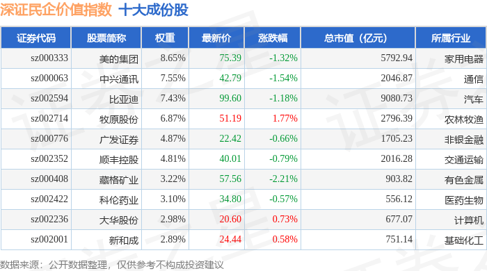 证券之星消息,11月3日,深证民企价值(970072)指数报收于3473.69点,跌0.09%,成交522.64亿元,换手率2.25%。当日该指数成份股中,上涨的有26家,天华新能以12.0%的涨幅领涨,下跌的有24家,永兴材料以4.52%的跌幅领跌。