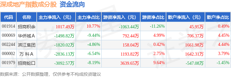 资金流向方面,深成地产(971001)指数成份股当日主力资金净流出合计8230.04万元,游资资金净流入合计4720.51万元,散户资金净流入合计3509.53万元。成份股资金流向详情见下表: