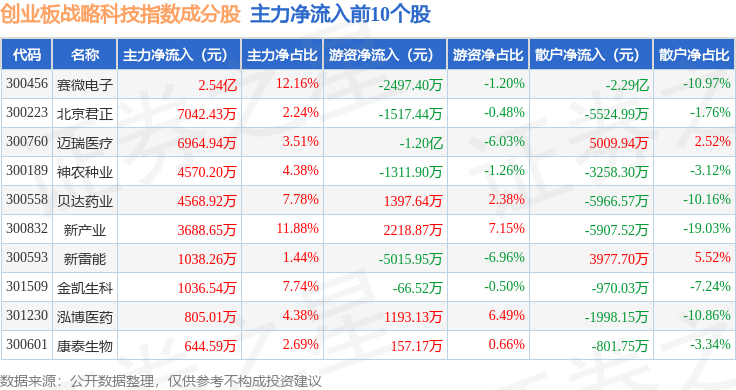 资金流向方面,创业板战略科技(971004)指数成份股当日主力资金净流出合计11.85亿元,游资资金净流入合计3.42亿元,散户资金净流入合计8.44亿元。成份股资金流向详情见下表: