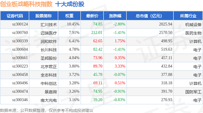 证券之星消息,11月3日,创业板战略科技(971004)指数报收于6411.31点,跌0.14%,成交379.68亿元,换手率3.94%。当日该指数成份股中,上涨的有28家,赛微电子以7.51%的涨幅领涨,下跌的有22家,透景生命以2.82%的跌幅领跌。