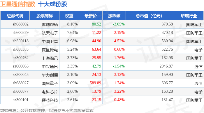 证券之星消息,11月3日,卫星通信(980018)指数报收于3788.92点,涨1.2%,成交420.82亿元,换手率1.13%。当日该指数成份股中,上涨的有35家,航天智装以19.98%的涨幅领涨,下跌的有15家,隆盛科技以3.5%的跌幅领跌。