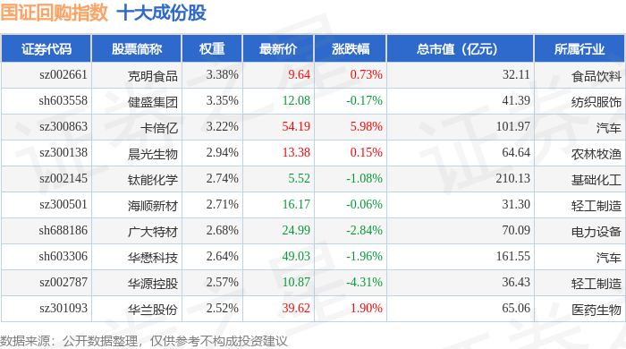 证券之星消息,11月3日,国证回购(980063)指数报收于3376.21点,涨0.33%,成交147.5亿元,换手率1.51%。当日该指数成份股中,上涨的有27家,众兴菌业以10.03%的涨幅领涨,下跌的有23家,若羽臣以5.11%的跌幅领跌。