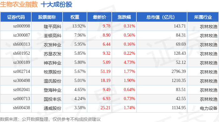 资金流向方面,生物农业(980072)指数成份股当日主力资金净流入合计6.63亿元,游资资金净流出合计9692.13万元,散户资金净流出合计5.66亿元。成份股资金流向详情见下表:
