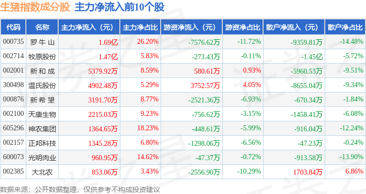 资金流向方面,生猪指数(980073)成份股当日主力资金净流入合计2.58亿元,游资资金净流出合计1068.33万元,散户资金净流出合计2.48亿元。成份股资金流向详情见下表: