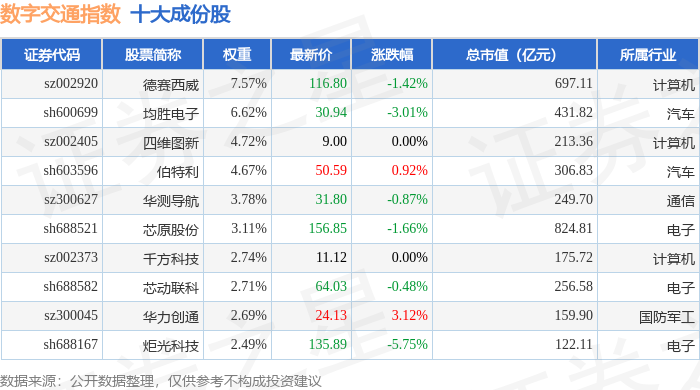 证券之星消息,11月3日,数字交通(980075)指数报收于3256.36点,涨0.29%,成交279.21亿元,换手率2.07%。当日该指数成份股中,上涨的有31家,航天智装以19.98%的涨幅领涨,下跌的有17家,炬光科技以5.75%的跌幅领跌。