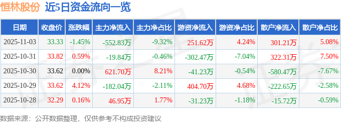 证券之星消息,截至2025年11月3日收盘,恒林股份(603661)报收于33.33元,下跌1.45%,换手率1.28%,成交量1.78万手,成交额5929.36万元。
