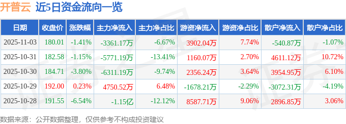 证券之星消息,截至2025年11月3日收盘,开普云(688228)报收于180.01元,下跌1.41%,换手率4.16%,成交量2.81万手,成交额5.04亿元。