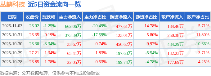 证券之星消息,截至2025年11月3日收盘,丛麟科技(688370)报收于26.02元,下跌1.25%,换手率2.84%,成交量1.24万手,成交额3230.39万元。