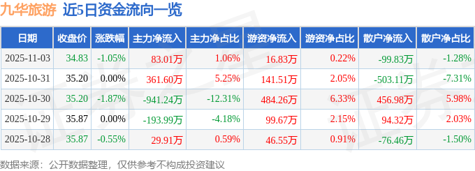 证券之星消息,截至2025年11月3日收盘,九华旅游(603199)报收于34.83元,下跌1.05%,换手率2.03%,成交量2.25万手,成交额7826.02万元。