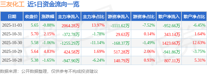 证券之星消息,截至2025年11月3日收盘,三友化工(600409)报收于5.65元,下跌0.88%,换手率1.27%,成交量26.12万手,成交额1.48亿元。