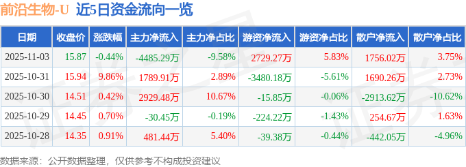 证券之星消息,截至2025年11月3日收盘,前沿生物(688221)报收于15.87元,下跌0.44%,换手率7.96%,成交量29.8万手,成交额4.68亿元。