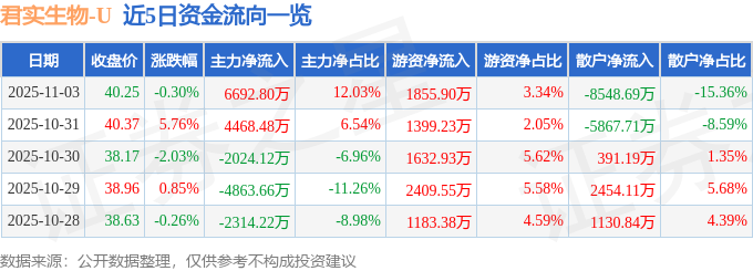 证券之星消息,截至2025年11月3日收盘,君实生物(688180)报收于40.25元,下跌0.3%,换手率1.81%,成交量13.84万手,成交额5.56亿元。