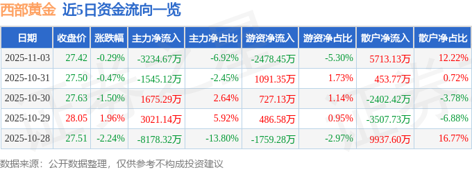 证券之星消息,截至2025年11月3日收盘,西部黄金(601069)报收于27.42元,下跌0.29%,换手率1.95%,成交量17.34万手,成交额4.68亿元。