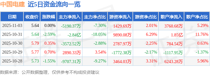 证券之星消息,截至2025年11月3日收盘,中国电建(601669)报收于5.64元,上涨0.0%,换手率0.97%,成交量126.6万手,成交额7.11亿元。