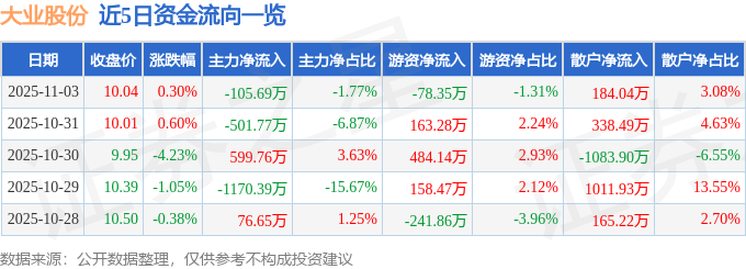证券之星消息,截至2025年11月3日收盘,大业股份(603278)报收于10.04元,上涨0.3%,换手率1.75%,成交量5.98万手,成交额5980.71万元。