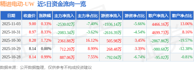 证券之星消息,截至2025年11月3日收盘,精进电动(688280)报收于9.0元,上涨0.33%,换手率7.35%,成交量38.26万手,成交额3.42亿元。