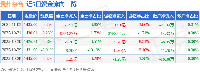 证券之星消息,截至2025年11月3日收盘,贵州茅台(600519)报收于1435.0元,上涨0.35%,换手率0.28%,成交量3.45万手,成交额49.45亿元。