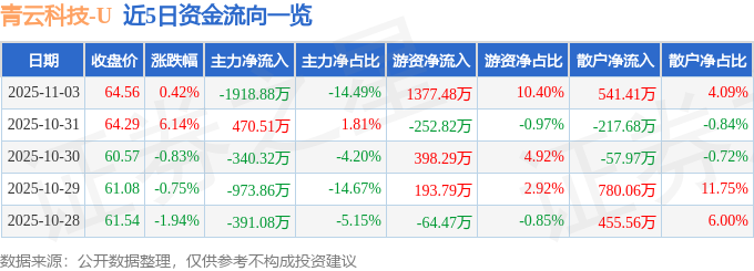 证券之星消息,截至2025年11月3日收盘,青云科技(688316)报收于64.56元,上涨0.42%,换手率4.33%,成交量2.07万手,成交额1.32亿元。